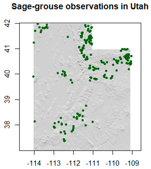The point dataset includes observations across different seasons of the year, with different density in space and time (over the different years). The final observations dataset, after preprocessing and before merging with the environmental variables for our models, included a total of 239 occurrences of sage-grouse present in our study area (Figure 2). Since the use of spatial points for the representation of the observation data is widely used in ecological models across the literature, we adopted the same approach in this study [32].