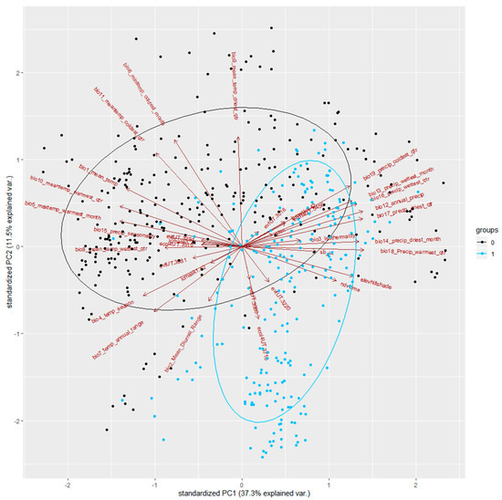 In Figure 4, we can inspect the observations and pseudo-absences across the environmental space that PCA produces. To interpret the biplot, the rules are: