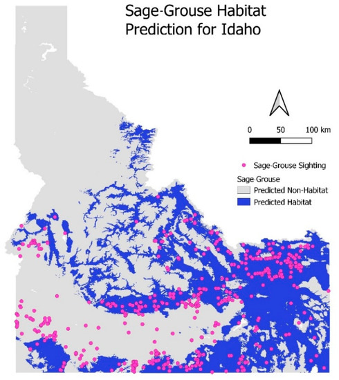 In 2002, the initial Strategic Management Plan for sage-grouse was implemented [29]. This is important to consider for all the species distribution modeling methods performed, as it is indicative of the importance of historical observation sites for sage-grouse as potential future habitats. Furthermore, attention should be paid to the documented elevation range of 4000–9000 feet for currently established sage-grouse habitats.
