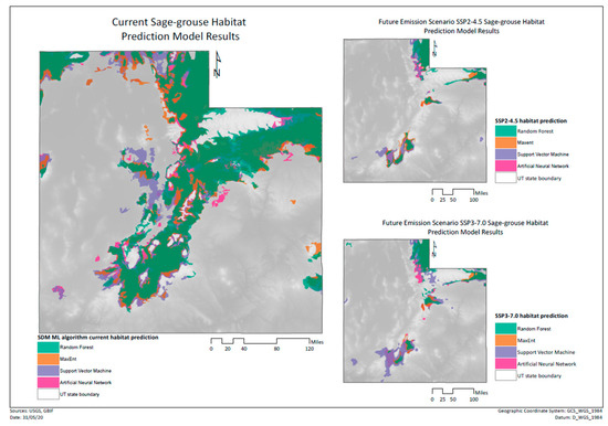Wildlife species’ habitats throughout North America are subject to direct and indirect consequences of climate change. Vulnerability assessments for the Intermountain West regard wildlife and vegetation and their disturbance as two key resource areas in terms of ecosystems when considering climate change issues. Despite the adaptability potential of certain wildlife, increased temperature estimates of 1.67–2 °C by 2050 increase the likelihood and severity of droughts, floods, heatwaves and wildfires in Utah. As a consequence, resilient flora and fauna could be displaced. The aim of this study was to locate areas of habitat for an exemplary species, i.e., sage-grouse, based on current climate conditions and pinpoint areas of future habitat based on climate projections. The locations of wildlife were collected from Volunteered Geographic Information (VGI) observations in addition to normal temperature and precipitation, vegetation cover and other ecosystem-related data. Four machine learning algorithms were then used to locate the current sites of wildlife habitats and predict suitable future sites where wildlife would likely relocate to, dependent on the effects of climate change and based on a timeframe of scientifically backed temperature-increase estimates. Our findings show that Random Forest outperforms other competing models, with an accuracy of 0.897, and a sensitivity and specificity of 0.917 and 0.885, respectively, and has great potential in Species Distribution Modeling (SDM), which can provide useful insights into habitat predictions. Based on this model, our predictions show that sage-grouse habitats in Utah will continue to decrease over the coming years due to climate change, producing a highly fragmented habitat and causing a loss of close to 70% of their current habitat. Priority Areas of Conservation (PACs) and protected areas might be deemed insufficient to halt this habitat loss, and more effort should be put into maintaining connectivity between patches to ensure the movement and genetic diversity within the sage-grouse population. The underlying data-driven methodical approach of this study could be useful for environmentalists, researchers, decision-makers, and policymakers, among others.