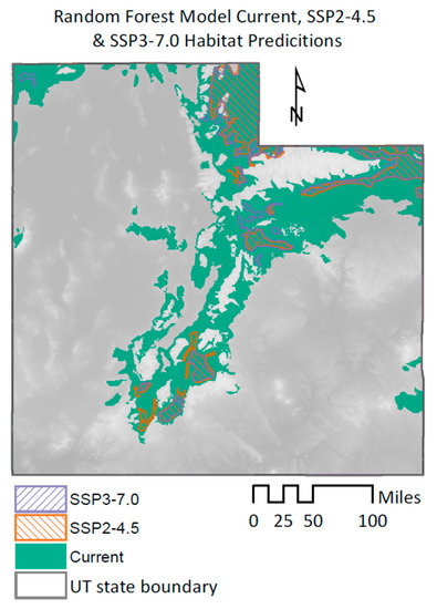 Moreover, the prediction maps obtained for both future climate scenarios seem to be in line with current predictions made specifically for sage-grouse habitats, in which they estimate that the species range will decrease by 71% for their breeding range and up to 92% for their winter range by 2080 [54]. Our predictions were made for the time period between 2041 and 2060, but since the temperature rise is expected to continue up to 2100, we can only expect that this trend will continue, and sage-grouse habitats will be further reduced.