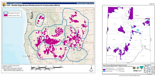 Comparing the future prediction model outputs to already existing sage-grouse management plan maps further stresses the significance of negative impacts on biodiversity. The 2013 USFWS Greater Sage-grouse Conservation Objectives Final Report [59] established Priority Areas of Conservation (PACs) for sage-grouse habitats. These were areas defined as long-term key habitats for sage-grouse as well as areas for the potential restoration and maintenance of sagebrush shrub [59]. Statewide areas of conservation value were acknowledged as imperative for maintaining and representing resilient sage-grouse populations by way of lek counts, telemetry, the collection of observation data, nesting area identification and assessing previously known species distributions. According to the documentation, the FWS PACs aligned well with BLM’s preliminary priority sage-grouse habitat maps (Figure 10).