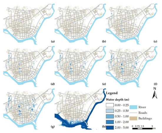- Su, B.; Huang, H.; Zhang, N. Dynamic urban waterlogging risk assessment method based on scenario simulations. Qinghua Daxue Xuebao/J. Tsinghua Univ. 2015, 55, 684–690. [Google Scholar]