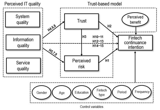 Although uncertainty and IT play critical roles in a sustainable development of Fintech, few studies have explored the relationships among uncertainty, IT, and Fintech continuous use. A deeper understanding of the interrelationships among uncertainty, IT, and Fintech continuous use can help Fintech providers to effectively attract and retain users, thereby accelerating the popularization of Fintech. Therefore, we investigated Fintech continuance intentions by applying an IT quality based perspective to a trust-based model. To evaluate overall perceptions of IT quality in Fintech, this study employed three IT quality dimensions (i.e., system, information, and service qualities) proposed by DeLone and McLean [13]’s information systems success (ISS) model. We then examined how IT quality can improve trust and reduce perceived risk to improve user willingness to continue using Fintech. Given the key role of IT in Fintech, IT quality may directly affect users’ continuance intentions by providing simple and speedy financial transactions, lower transaction costs, and temporal and spatial flexibility using mobile applications [5]. To validate the direct effect of IT on Fintech use, we conducted a mediation test of trust and perceived risk between IT quality and Fintech continuous use. That is, if no mediation effect exists between trust and perceived risk, IT quality should directly affect Fintech continuance intentions, demonstrating that high-quality IT by itself can retain Fintech users and facilitate Fintech use. However, a full mediation effect implies IT quality has only an indirect effect on Fintech continuance intentions, leaving no true innovator role for IT in Fintech innovation. Therefore, this study aimed to (1) investigate the direct effect of user trust and perceived risks on Fintech continuance intentions; (2) examine the direct effect of IT quality on user trust and perceived risk; and (3) determine the direct effect of IT quality on Fintech continuance intentions.