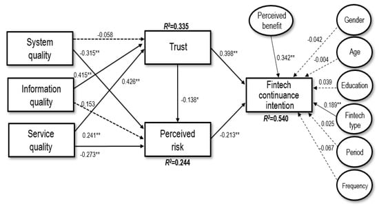 Second, we found that high levels of service quality simultaneously improve trust and reduce perceived risk, which had the strongest effect on Fintech continuance intentions among the three quality dimensions. Previous studies showed that service quality is critical to facilitate behavioral intentions in many e-banking and e-commerce services [7,23,33,66]. Consistent with extant studies, our results indicated that service quality significantly affects both trust and perceived risk, although service quality is slightly more effective at mitigating perceived risk (β = −0.273, p < 0.01) than improving trust (β = 0.241, p < 0.01). For example, high service quality, such as immediate responsiveness and a willingness to help, breeds confidence among users that Fintech transactions are trustworthy, resulting in a willingness to continue using Fintech. Fintech that offer high service quality can therefore reduce concerns and doubts of Fintech users about providers’ abilities, replacing those fears with confidence. Given that the effect of service quality on both trust and perceived risk is greater than that of other two quality factors, service quality is the most important quality factor among the three dimensions for controlling uncertainty and encouraging continued use of Fintech.