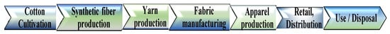 The arrival of fast fashion has put pressure on the textile and apparel industry to harmonize the procedures with manufacturing, production plans, supply chain, inventories of outlets, and logistics warehouses []. This is because most textile and apparel products are seasonal in nature and consumers’ tastes are changing frequently [,]. Therefore, a large amount of money can be lost by textile and fashion companies due to extravagant outdated stock []. In addition, the industry is considered generally to have a great environmental sustainability impact as well as causing concern regarding human rights due to hazardous chemical usage in order to grow cotton, dyeing textile products, and other value chain processes. A complete value chain of textile and apparel is illustrated in Figure 1. It is added to the ecosystem impact of this globalized consumption of water, energy, and land, and polluting the rivers and atmosphere to a great extent. Increasing textile wastes from low-quality frequent clothing replacement for short-term use is a critical issue of the textile and apparel industry. A detailed list of socio-economic and environmental issues related to the complete value chain of textile and apparel is presented in Table 1.