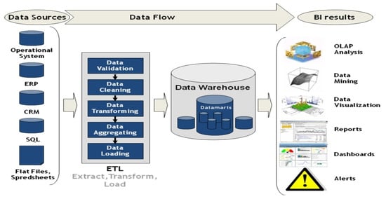 Therefore, innovative efforts and procedures are crucial in searching for the best solutions for resolving the economic, environmental, and social issues within the fast-fashion-driven textile and apparel industry. Thus, precise and authentic information is required for decision-making in contemporary business scenarios. In today’s digital world with multimedia, social media, and Industry 4.0 concepts, industries are generating data exponentially. This fast pace of data generation creates opportunities and challenges not only for individuals but also for industries. This great volume of data generation is called big data []. The use of big data for decision-making drives the industry experts to adopt the BIS []. A traditional BIS architecture is comprised of numerous components; for example, extract, transfer, and load (ETL), analytical tools, data warehouse, data marts, dashboards, score board, enterprise resource planning (ERP), supply chain management (SCM), human resource management (HRM), customer relationship management (CRM), online analytical processing (OLAP), and some other related components according to the organizational requirements. []. BIS architecture, including other elements, often consists of both structured and unstructured data. These data come from both internal and external sources and are transformed from raw transactional data into logical information, as shown in Figure 2.