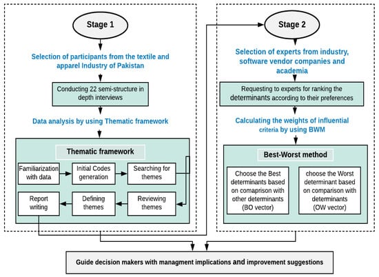 The textile and apparel industry of Pakistan has been chosen for this study because the Pakistani textile and apparel industry has ample experience and tradition since the 19th century, as well as a good reputation around the world. In addition, Pakistan has a complete textile value chain as compared to many countries which only have a finished or primary base of the textile industry. Complete value chain of the textile industry like in the Pakistani industry is rare in the world []. A qualitative research approach was adopted for data collection in two stages, as shown in Figure 3. It was chosen because the exploratory nature of this method allows the researcher to obtain a deep understanding of a hidden phenomenon of interest that is based on human experience and behavior []. This approach uses language to obtain deeper insights into human phenomena of interest, in this case, the BIS adoption process [,]. In the first stage, data were collected by using semi-structured in-depth interviews. The interpretive nature of interviews enables the researcher to know the detailed descriptions of each process and allows to grasp the true essence of the phenomenon being studied [,]. Initially, a purposive sampling technique was applied for participant selection and a snowball sampling technique was used to find additional participants. Both techniques are helpful in identifying, selecting, and approaching experienced and knowledgeable interviewees []. Finally, potential experts were identified and selected by applying particular criteria, such as their positions in their organizations, having expertise and being familiar with BIS and their components. Designation levels were used as an indicator of decision-making status in a company with an owner manager, IT manager, and other executive posts which empower them to take decisions for implementation and adoption of any innovation in their organizations. A total of twenty-two interviews were conducted from seventeen textile and apparel companies. The number of cases was considered appropriate following various studies’ recommendations that when repetition of ideas or patterns have emerged then the study is deemed to have reached theoretical saturation []. However, many researchers have suggested that a minimum number of cases of four or five is considered sufficient to gain theoretical generalizability [,] and do not allow more than fifteen cases for comfortable understanding of “local dynamics” []. Before final data collection, two pilot interviews were conducted with two industry experts to check the reliability of the questions and whether the questions were understandable. The interview duration was approximately from thirty-five minutes to eighty minutes. A thematic analysis framework was used to code and interpret the data. It was considered appropriate for this study due to its relevance and strength. The current study employed Braun and Clark’s [] six-phase thematic framework for data analysis, which consists of (1) familiarization with the data, (2) generating initial codes, (3) searching for themes, (4) reviewing themes, (5) defining themes, and (6) report writing. Further, biases related to sample and findings were dealt with in the secondary data, which enhanced the results’ reliability for triangulation purposes []. In the second stage, fifteen experts were selected by using a purposeful sampling strategy with people of different backgrounds such as experts from textile and apparel industry, software vendors, and academics. The total extracted determinants from the stage-one research were sent to the fifteen experts and they were requested to rank them according to their preference criteria as BEST or LEAST (see Appendix A).