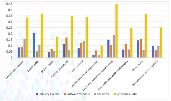 The results of the first-stage research were used to select the important criteria for the second-stage research. A total of ten determinants were used as the input for the second-round research. Determinants were categorized into four dimensions (e.g., individual, technological, organizational, and environmental). Ten extracted determinants were considered significant to influence the adoption of BIS in the textile and apparel industry. These determinants are competitive pressure; sustainability; market trends; compatibility; technology maturity; satisfaction with existing systems; leadership commitment and support; sustainable data quality and integrity; users’ traits; and interpersonal communication (termed respectively as R1 to R10) in Table 3. By using BWM, the calculated weights of the selected items are also reported in Table 3. The required vector-based comparisons achieved a consistency ratio below the threshold limit of 0.1, validating the appropriateness of the estimated weights []. The analysis and threshold values are based upon the suggestion of experts from multiple sectors: textile and apparel industry, software vendor companies, and academia. It is revealed by the analysis of results that the most important factor is the top leadership commitment and support followed by sustainability, users’ traits, and technology maturity. Satisfaction with existing systems and interpersonal communications are considered to be the least important. The opinions of experts are inconsistent in terms of given weights and importance of determinants. Industry experts believed that the role of sustainability determinant (R2: 0.366) followed by leadership commitment and support (R7: 0.151), users’ traits (R9: 0145), and technology maturity (R4: 0.113) are very important for BIS adoption. On the other hand, software vendors considered the most important determinants for BIS adoption to be users’ traits (R9: 0.156), technology maturity (R4: 0.168), sustainable data quality and integrity (R8:0.113), and academic scholars confirmed the value of top leadership commitment and support determinants (R7: 0.191), competitive pressure (R1: 0.158), compatibility (R5: 0.139) as the leading determinant of second and third priority. Finally, the synthesized analysis of results reveals that the leadership commitment and support, sustainability, users’ traits, and technology maturity determinants are ranked high as the first, second, third, and fourth from each dimension (R7: 0.446; R2: 0.366; R9: 0.364, R4: 0.346). Graphical detail is also shown in Figure 4.