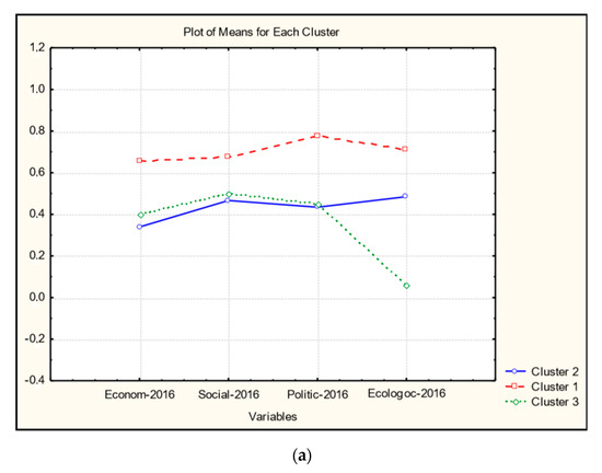 Charts of the mean values of economic security components by clusters: (a)—2016; (b)—2017; (c)—2018. Source: Calculated by the authors.