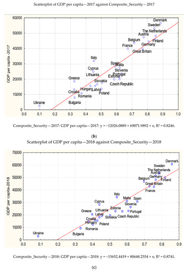 Scatterplot of the composite security indicator against GDP per capita by years: (a)—2016; (b)—2017; (c)—2018. Source: Calculated by the authors.