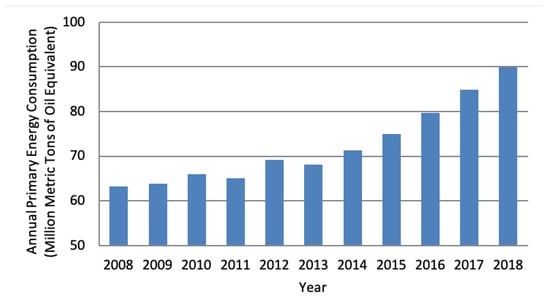According to the State of Industry Report 2018 [48] published by National Energy and Power Regulatory Authority (NEPRA) Pakistan, around 64% of the total energy in the country is produced through thermal resources (e.g., natural gas, coal, and furnace oil), 26% of total energy by hydel, 6% of total energy by renewable and remaining 4% of total energy by nuclear, see Figure 1a. On the energy end-use, around 46% of the total produced energy is used for residential purposes followed by the industrial sector at 25% and the transport sector at 20%, etc., see Figure 1b. Overall energy end-useEnergy consumption in Pakistan from 2008 to 2018 is depicted in Figure 2 [49,50]. In five years duration from 2013 to 2018, over 30% increase is observed in overall energy end-use. From the fiscal year, 2013 to 2014 with payment of circulation dept of PKR 480 billion to independent power producers (IPPs) initiated the electricity production [51], and so it affected overall energy consumption. Furthermore, in these five years from 2013 to 2018, nearly 7000 MW electricity was added in the national grid to overcome energy shortfall in Pakistan. In the energy mix, as already shown in Figure 1a, Pakistan is largely dependent on fossil fuel-based thermal energy, and among these fossil fuels share, more than 50% is fulfilled by natural gas. Certainly, with depletion of natural gas reserves, Pakistan has to rely on liquefied natural gas (LNG) import, and so from 0.7% to 8.7% overall share of LNG in energy end-use from 2015 to 2018 [52]. Moreover, economic growth and population growth link with an increase in overall energy end-use of a country, and for Pakistan, from 2013 to 2018 GDP growth was around 30% and annual population growth stated greater than 2% [53].