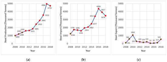 Steel: (a) Production, (b) Import, and (c) Export in Pakistan from 2008 to 2018.