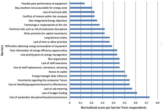 The developed questionnaire mainly consists of four sections, which include barriers for energy efficiency, driving forces for energy efficiency, extra potential in energy management policy, and information sources regarding energy-efficient operation of iron and steel sector. In barriers for the energy efficiency section, the respondent is required to grade twenty-three barriers, see Figure 4. In driving for the energy efficiency section, the respondent is required to grade thirty-five drivers, see Figure 5. In the third section of the questionnaire, the respondent is required to grade twenty-three extra potentials related to energy management policy, see Figure 6. In the information sources section, the respondent is required to grade fourteen modes, see Figure 7. The questionnaires were shared with all iron and steel mills registered in the Pakistan Stock Exchange, and 68% of these mills responded to us. In general, most of these mills lack in any sort of energy management and optimization, even in few of these mills there is not any separate department for energy efficiency. Hence, the questionnaire was filled out by staff from the production and quality departments of the understudy mills. The provided closed-end questions were required to grade between “1” and “5” by the mills’ employees, where “1” shows the evaluating criteria is of least importance and “5” shows the evaluating criteria is of significant importance and effective. The collected results from the participated mills were rated by taking the average score of each criterion. The most effective criteria were the one with the highest average score and presumably reflect overall iron and steel mills’ barriers to drivers for added values of energy efficiency. Moreover, results were normalized for range 0 to 1 and presented graphically for comparison. Furthermore, normalize scale is divided into five levels: very low (0 to 0.2), low (0.2 to 0.4), moderate (0.4 to 0.6), high (0.6 to 0.8) and very high (0.8 to 1).