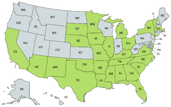 The US States where horizontal directional drilling (HDD) residues were collected (green).