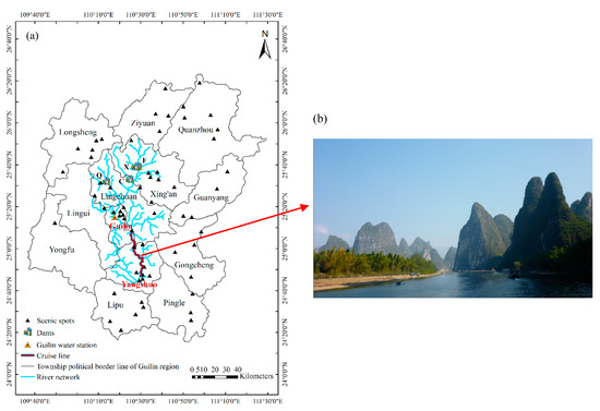 Since the 1960s, the rapid growth in river-based tourism, and especially cruise tourism (“a socio-economic system generated by the interaction between human, organizational and geographical entities, aimed at producing maritime-transportation-enable leisure experiences” [8]), has led to increasing concern regarding the environmental impacts of this tourism sector [9,10]. The boom in cruise tourism has brought about substantial local and regional economic benefits, including increased employment, infrastructure development and the expansion of urbanization [11]. The consequence of these developments can have serious negative impacts on water resources and the natural environment [12,13]. Most research into the relationship between cruise tourism and water resources focuses on water pollution and other environmental issues [12,14], while the effects of stream flow changes on cruise tourism remains underexplored. The Lijiang River, one of 13 state-level key protected rivers in China, is located in the Guilin region, in the northeast Guangxi Zhuang Autonomous Region. River cruise tourism from Guilin to Yangshuo takes place along an 83 km meandering waterway that runs through the largest and the most spectacular karst tourist attraction of the world (Figure 1). River cruise tourism along the Lijiang River officially commenced in 1973 with five cruise boats with a total capacity of 440 passengers. In 1982, the Lijiang River scenic zone was listed as one of 44 national scenic spots in China. The Lijiang River scenic zone received a 4A national ranking in 2001 and a 5A ranking in 2007. In 2012, there were 234 three- and four-star level cruise boats on the river with a passenger capacity of 18,802 [15]. According to the government report, the carrying capacity for Lijiang River cruise tourism is 19,000 passengers per day [16]. As a corridor, the Lijiang River connects downtown Guilin and Yangshuo County with more than 18 scenic spots in the middle and lower reaches of the river with 3A or higher rankings. As such, it represents the core area of socio-economic growth in the Guilin region [17]. Because of this, cruise tourism from Guilin to Yangshuo plays a critical role in the Guilin–Lijiang River–Yangshuo tourism destination system and in regional economic growth [18]. Tourism development has been booming based on the distribution of tourism resources and accelerating the economic growth in the Guilin region [17,18]. Downtown Guilin is the core zone of a cluster of tourism resources and tourist services. The Merryland Resort in Xing’an County and Longji Terraced Rice Fields in Longsheng County represent the northern core areas of tourism in the Guilin region. Yangshuo County is the southern core areas of tourism, and it contains a number of historic and cultural heritage sites, and karst landscape scenic spots.