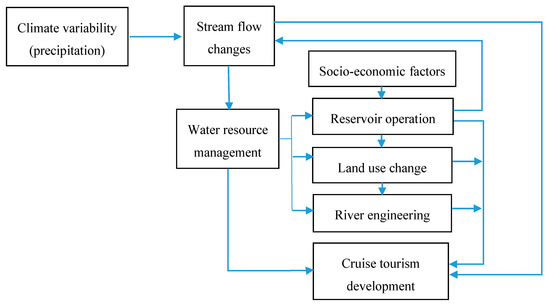 We used linear regression to analyze recent trends in cruise tourism development and stream flow change, and applied the Pearson correlation analysis and the Granger causality test to evaluate the effects of stream flow changes on cruise tourism, based on selected stream flow parameters and cruise tourism indicators. We then explored the effects of climate variability (in this case, precipitation) and socio-economic factors (in this case, reservoir operation, land use change, and river engineering) on stream flow and, therefore, cruise tourism development. Figure 2 is a simplified flow chart of this study.