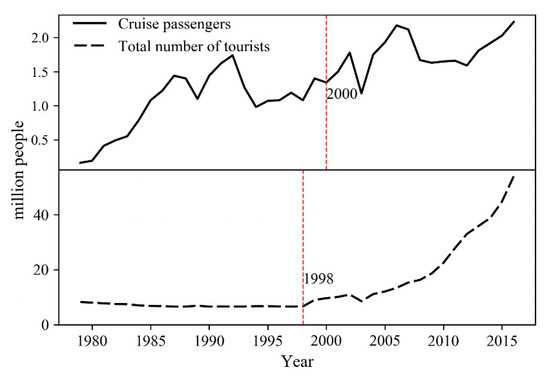 Temporal trends in the number of cruise passengers and total number of tourists from 1979 to 2016. The number of cruise passengers showed a tendency to increase on the whole, while the total number of tourists significantly and abruptly increased after 1998.