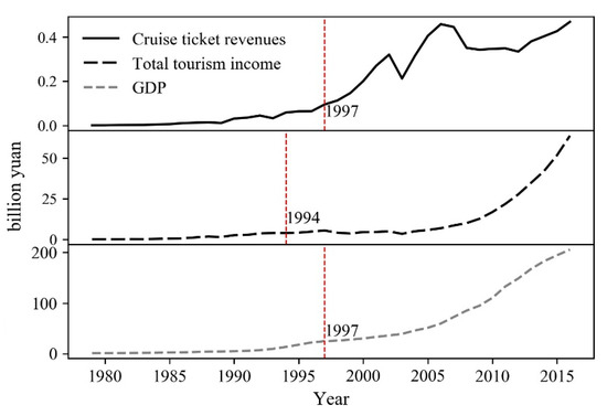 Missing data for total number of tourists and tourism income in the Guilin region from 1979 to 1998 were interpolated using regression analysis based on tourist and tourism income data from 1999 to 2016. To compensate for missing cruise passenger number data for 2010, 2013, and 2014, we interpolated from average data from the preceding and succeeding years. Further, we replaced missing cruise ticket prices from 1979 to 1983 with prices from 1984.
