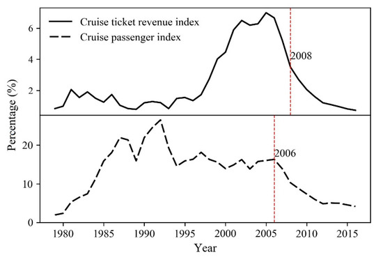 Recently, both cruise ticket revenue and cruise passenger indices have displayed a decreasing trend, particularly after 2006 (Figure 5). The cruise ticket revenue index fluctuated from 1979 to 1996, followed by a sharp increase from 1.35% in 1996 to 6.99% in 2005, with a small decrease in 2003 and 2004. A decreasing trend after 2006 was followed by an abrupt decrease in 2008 (p = 0.02), indicating a shrinking in the contribution of cruise ticket revenue to total tourism income. The cruise passenger index increased rapidly from 1.95% in 1979 to 26.49% in 1992, with a drastic decrease in 1989. Following 1992, there were sharp decreases in 1993 and 1994, followed by a fluctuating decrease from 1995 to 2006, and then an abrupt decrease after 2006 (p = 0.03).