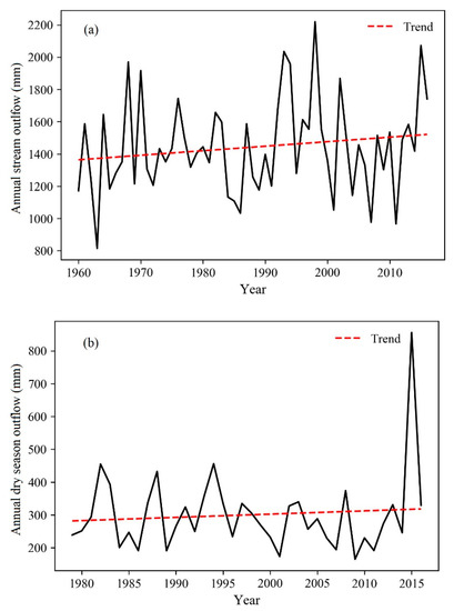 Trends in (a) annual stream outflow and (b) dry season outflow from 1960 to 2016. Neither annual stream outflow nor dry season outflow increased significantly, with p values of 0.23 and 0.63, respectively.