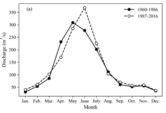 where and are the mean values of stream flow during the pre-regulation (1960 to 1986) and regulation period (1987 to 2016), respectively.