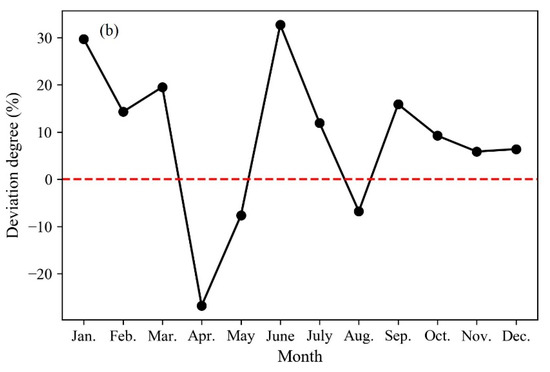 (a) Monthly stream flow changes and (b) their degrees of deviation during the period from 1987 to 2016 compared to the period from 1960 to 1986. Monthly stream flow in April, May, and August decreased during the period from 1987 to 2016 compared to the period from 1960 to 1986. The red line in (b) represents the zero deviation.