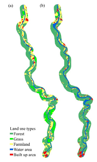 Spatial distribution of land use types in the buffer zone around the cruise line: (a) 2000 and (b) 2015.