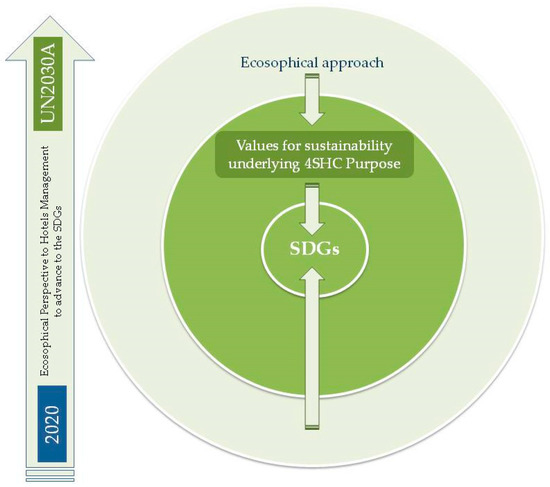This paper presents the results of the first part of an investigation carried out with the 4S-SM-HC, in which the values for sustainability on which the hotel company has based its purpose are investigated, explored, and made explicit from an ecosophy perspective, creating direct inter-relations with the five dimensions of the SDGs. Conducted through qualitative methodology, it provides a holistic and ecosystemic vision that will make way for the second part of the research, which will focus on the definition and verification of a Sustainable Strategic Management Model (SSMM) built on ecosophical values to contribute to the SDGs effectively. In this way, the 4S-SM-HC can move coherently and effectively from its Purpose to the implementation of the SDGs. This paper has a double objective: (1) to provide a conceptual framework with an ecosophical approach for 4S-SM-HCs to reflect and discuss the values for sustainability implicit in their purpose, and (2) to create the theoretical framework with an ecosophical approach on which to support the SSMM for the hotel company under study, since incorporating values for sustainability in the decision-making process is essential to progress towards sustainability and, consequently, towards the goals proposed by UN2030A [117].