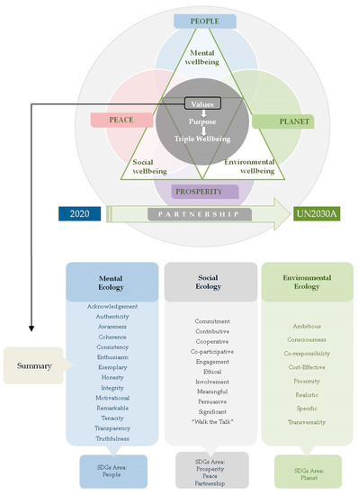 These values for sustainability exposed are not absolute but come from an in-depth reflection of the 4S-SM-HCs under study. Therefore, this research aims not to providing set ‘‘in stone” values, but to invite other 4S-SM-HCs to take part in introspection and reflection on their values in the three ecosophical scopes. This discussion goes beyond the academic lens and into the business world, since only by deepening the practical concept of an ecosophy will it allow them to move towards “Triple Wellbeing” by making a better and more coherent contribution to the five areas of the UN2030A (Figure 4).