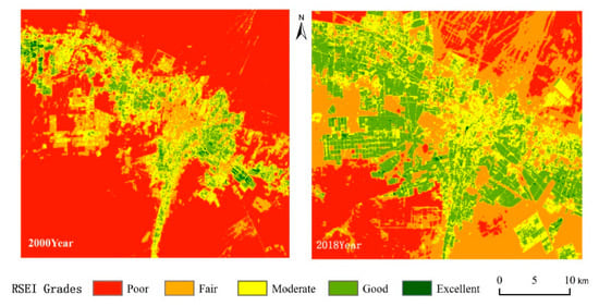 RSEI Classification of the Hami Oasis from 2000 to 2018.