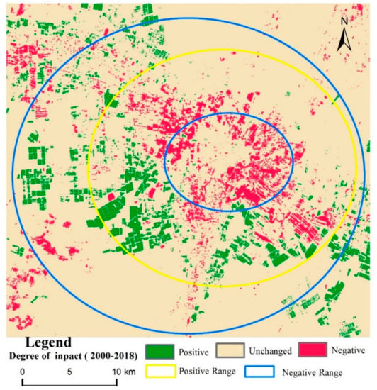 In Figure 3, the blue circle shows the range of deterioration, and the yellow circle indicates the range of improvement. The areas with worse ecological quality were scattered, while the areas with better ecological conditions were distributed around the areas with worse ecological conditions in a ringlike nested distribution. Figure 2 shows that the areas with better ecological quality with reasonable planning and development over the past 18 years were mainly areas expanded into by artificial oasis in 2018 [6,57], which was of great significance to the expansion of the Hami Oasis. This shows that the main reason for the better ecological quality of the oasis in the arid region was the rapid development of an artificial oasis, while the deterioration of oasis ecology was due to the expansion of the built-up area. The built-up area changed its original ecological appearance to a certain degree, yet the development processes of the built-up area and the oasis area were mutually promoted and developed. With increases in the built-up area, the population and economy in the arid region developed rapidly. To obtain more living space, the residents of this area continuously cultivated a larger artificial oasis. To a certain degree, this artificial oasis not only improved the local barren desert landscape but also changed its ecological quality.