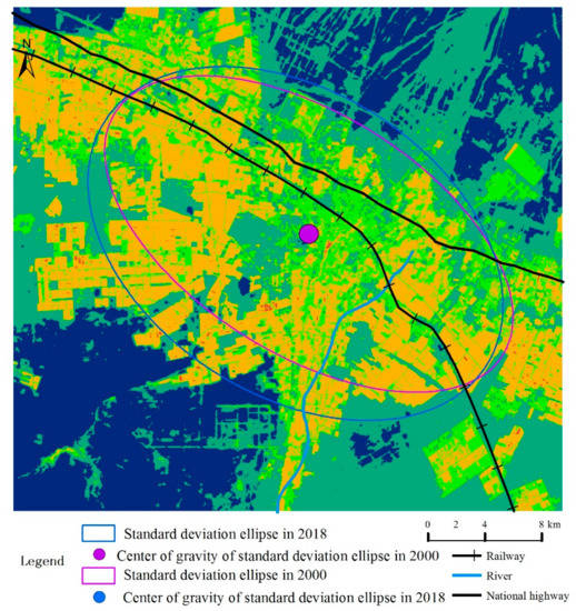 From a diachronic perspective, compared with 2000, the minor axis of the ellipse in 2018 showed an increasing trend, and the increase in the minor axis on the north side was smaller than that on the south side, suggesting that the development of the Hami Oasis over 18 years mainly focused on the southern part of the oasis. Figure 1 and Figure 4 show a small increase in the short axis on the north side due to the large built-up area on the north side. According to the actual research, this area is the northern industrial park of Hami [61]. Due to being affected by the higher regional terrain and large areas of Gobi, this park is more suitable for developing industry than agriculture. Since the emergence of industrial parks changed the original desert landscape, the ecological quality of the north has improved over the course of 18 years of development.