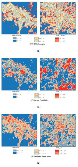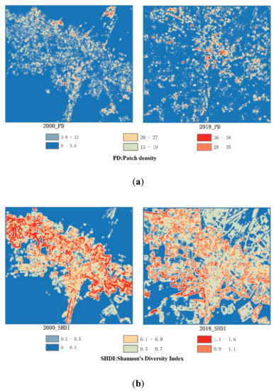 Figure 5 shows that the landscape index of the Hami Oasis was distributed regularly, and the ecological quality of the oasis also had a certain degree of correlation with the internal space. The Patch Density (PD) (Figure 5a) [62] changed significantly from 2000 to 2018. The red area represents a larger patch density value, while the darker the color represents higher fragmentation of the ecological land and higher heterogeneity of the landscape. In 2000, the PD value range in the central area of the city and the surrounding area was 0 to 3.8, while in 2018, the range was from 36 to 58, signifying that the location was highly ecologically fragmented. Over the past 18 years, the fragmentation of the ecological landscape in the central area of the city has continued to increase, reflecting the acceleration of urbanization and the greater transformation of the original surface.