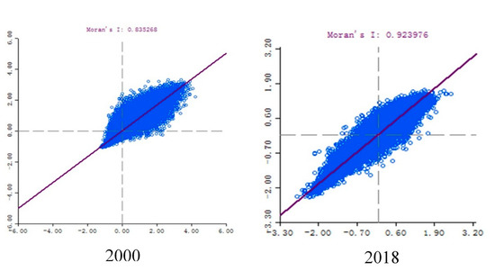 Using Moran’s I index and scatter plot (Figure 7), the RSEI of the Hami Oasis from 2000 to 2018 was analyzed via spatial autocorrelation. The Moran’s I scatter plot drawn by the Open GeoDa software can qualitatively distinguish the relationship between the RSEIs in each region. In Figure 2, the high values surrounded by high neighboring values are High–High (H–H), the low values surrounded by low neighboring values are Low–Low (L–L), the low values surrounded by high neighboring values are Low–High (L–H), and the high values surrounded by low neighboring values are High–Low (H–L). The degree of autocorrelation of Moran’s I index in 2000 was relatively strong, with 0.835268. Compared to 2000, the Moran’s I index increased significantly in 2018, reaching a higher value of 0.923976, indicating that it has a strong positive correlation and a certain internal relationship between the ecological environment quality of the study area. In 2000, the RSEI distribution points were clustered in the first quadrant, indicating that the difference in RSEI were small in areas with high ecological environment quality. In 2018, the RSEI point clusters were distributed in the first and third quadrants, which is very different from the distribution in 2000. The point clusters in the third quadrant showed that the RSEI differences increased in areas with lower ecological environment quality [74].