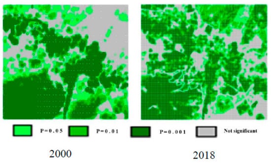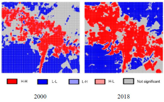 In future urban planning, proper consideration should be given to renovating or minimizing bare land. The region of H–H mostly reached a significance level of 0.05 in 2000. A significance level of 0.01 was mainly observed in the H–H and L–L areas, where the ecological environment quality has a strong correlation. The region with a significance level of 0.05 was mainly located in the periphery of the region where the significance level reached 0.01. The region of H–H mostly reached a significance level of 0.01 in 2000 and 2018 [78,79].