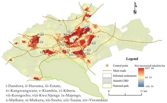 In order to further analyze the population density changes in different areas, we used ArcGIS 10.4 software to calculate the net increased population in Nairobi by subtracting the population grid values of 2000 from that of 2020. Figure 4 shows a quite-small increase in population density nearby Nairobi CBD from 2000 to 2020. However, large-scale informal settlements are distributed around the CBD, such as the Kibera and Mathare slums. The areas outside the urban core area, mostly informal settlements, are witnessing significant population growth. The informal settlements are hot spots for population increase in Nairobi.
