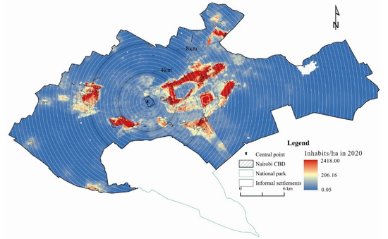 The governance and urban management of informal settlements in Kenya are complex and have systematic issues. A series of upgrading programs has been implemented. However, due to the lack of accurate understanding of the characteristics of informal population distribution, many efforts have not achieved the expected results [52,53]. Our study concludes that the settlements nearby the 4-km and 8-km belts are more attractive to new urban immigrants. More people are willing to settle in the areas close to the urban core, which will put tremendous pressure on the population density and living conditions of informal settlements in this area.