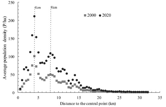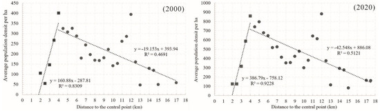 The correspondence between average population density and the linear distance to the central point is demonstrated in a scatter plot (Figure 6). It is observable that the trends of the two periods are similar for the past 20 years. The maximum population density appears within the area of 4 km from the central point. The correlation between population density and distance seems positive within a 4 km area, while in areas outside 8 km, they are negatively related. Therefore, we used the piecewise function to fit the regions inside and outside the 8 km circle.