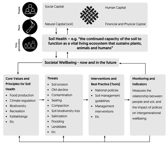 A well-being approach to soil health (adapted from [56,57]) (The soil health definition cited in the framework is from [58]. Kaitiakitanga is defined as guardianship of the natural environment.).