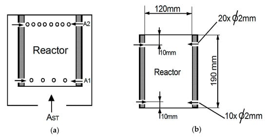 Air is introduced in the combustion chamber (Figure 3a) through the inputs A1 (primary air for gasification) and A2 (secondary air for total combustion). The total air flux AST is guaranteed by a 3 W fan at 12 V DC. A small speed controller allows for the regulation of the airflow in the reactor. A lithium-ion battery (12 V; 9 Ah) and a solar panel (5 W) provide the necessary power for the system. The primary air enters through 10 small holes of 2 mm in diameter located 10 mm from the bottom of the reactor. The secondary air enters the reactor through 20 small holes 2 mm in diameter at the top of the stove (Figure 3b).