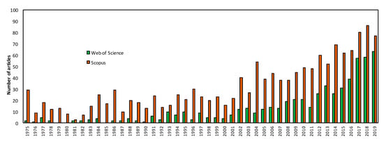 Graph of the number of scientific articles indexed in Web of Science (WoS) and Scopus for the topic “brick kiln” (1975 to 2019).
