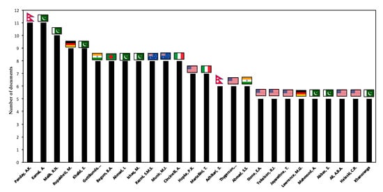 Using the exact topic “brick kiln” between 2013–2019, 98 and 233 documents in WoS and Scopus were found, respectively. These articles are divided into various topics: emissions (36%), pollutant (26%), efficiency (13%), biomass (13%) and design (12%). Figure 2 shows that the main authors researching “brick kiln” have affiliations in Pakistan and United States. The main authors focused their research on pollution caused by brick making. e.g., Kamal et al. [] evaluated the health risks of BK workers to dust-bound polycyclic aromatic hydrocarbons (PAHs) exposure in Punjab province (Pakistan). This study also emphasized the need for pollution control in the BK industry of Pakistan. Kamal et al. [] evaluated the atmospheric concentration levels and ambient exposure of PAHs in Gujranwala, Lahore and Rawalpindi districts of the Punjab Province (Pakistan). Results also showed that ~88% of the atmospheric PAHs could be attributed to the wood combustions, out of which more than 50% of wood combustion were possible with the BK sector.