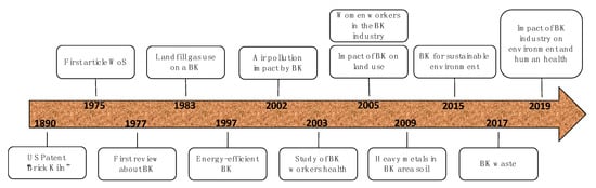 Diagram of important milestones in the history of the brick kiln (BK) [,,,,,,,,,,,,].