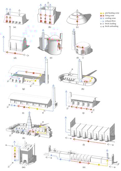 Drawings of the intermittent and continuous ovens. The arrows indicate the flow of brick loads and gas flow. (a) Open kiln without fixed walls (rectangular), (b) open kiln with fixed walls, (c) open kiln without fixed walls (cylindrical), (d) down-draught, (e) MK, (f) dome, (g) Hoffman, (h) Bull’s Trench, (i) Cedan, (j) multi-chambers, (k) zigzag, (l) mobile-modular, (m) vertical shaft and (n) tunnel.