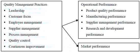 Saraph et al. [] were among the first to conduct the empirical study for TQM. Based on extensive literature review and feedback from the participated companies, Saraph and co-workers successfully developed eight TQMs. Flynn [] also conducted relatively significant research on QMP. They focused on the manufacturing industries and successfully developed eight measurable practices. The above frameworks serve as the foundation for the recent QMP and had been adapted widely for empirical work. These practices were being adapted as well during the development of the quality awards framework, such as the Malcolm Baldrige Quality Award (MBQA) framework []. However, the application results of such frameworks were inconsistent as positive effects [], no effect [], and adverse effects [] were reported.