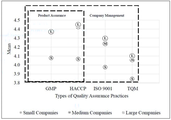In Malaysia, quality systems were first launched in 1987. The earliest system introduced was the ISO standard []. Up to 2014, there was a total of 11,487 companies in Malaysia with ISO 9001 standard certification and 311 companies certified with the ISO 22000 system []. Besides the ISO system, other quality systems, including the HACCP, GMP, and Halal assurance system (HAS), are widely implemented by food manufacturing companies in Malaysia []. The QMP is not only important to assure the product quality of an organization but also to enhance the performance of the organization []. However, companies of different sizes are believed to implement QMP with distinction []. Small and medium-sized companies have more limitations as compared to the larger-sized companies concerning the implementation of an effective and efficient QMP, and this is due to the limitations of the resources and the shortage in the QMP related processes [].