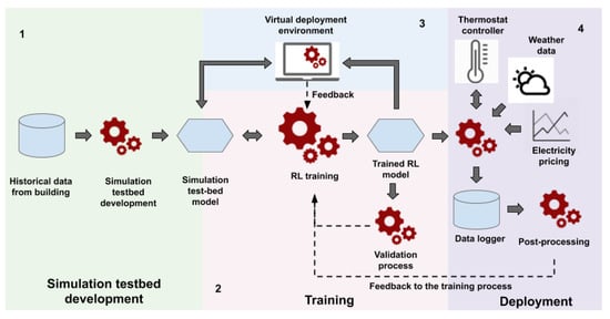 - Zhang, Z.; Lam, K.P. Practical implementation and evaluation of deep reinforcement learning control for a radiant heating system. In Proceedings of the 5th Conference on Systems for Built Environments (BuildSys 2018), Shenzen, China, 7–8 November 2018; Association for Computing Machinery: New York, NY, USA, 2018; pp. 148–157. [Google Scholar] [CrossRef]