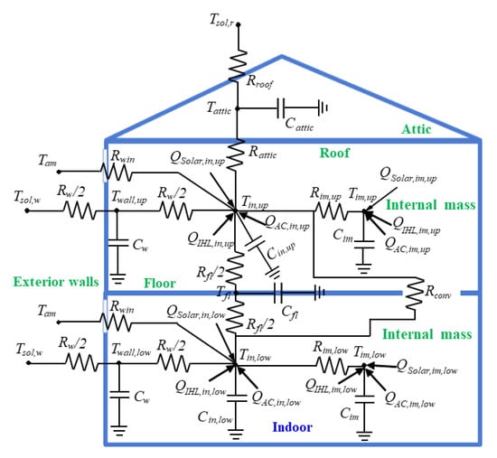 In order to expeditiously train and test the performance of the RL model, it is necessary to simulate the thermal response of the building in response to the RL decisions. In addition to a thermal model of the building, the HVAC system and controls must be modeled. For this study, the building model was developed based on data recorded in an unoccupied research house located in Knoxville, TN, USA (pictured in Figure 2). The house was built in 2013 and meets the requirements of IECC 2006 [26]. a grey-box model was developed using an electrical network equivalent model to represent the thermal resistance (R) and capacitance (C) associated with different components of the home as shown in Figure 3. The model results in a set of eight ordinary differential equations used to calculate the temperatures of the indoor air, internal mass, and wall temperatures of each zone in addition to the attic temperature. The model includes the effect of outdoor air temperature (), sol-air temperature () [27], direct solar radiation, air conditioner cooling, and internal heat load. This model approach is very similar to the model developed in [28].