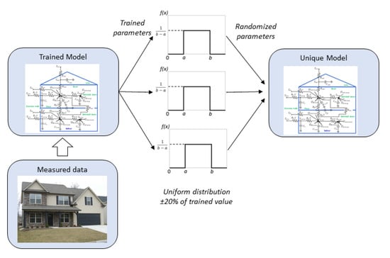 In order to test the ability to deploy a pre-trained RL model in different homes, a set of homes with different thermal responses was required. To achieve this, we varied the parameters, including not just the trained parameters but also the geometry and area parameters used to determine solar exposure and calculate , of the building model described in Section 3.1. Given the large diversity in building shape, size, and construction, 39 of the 40 building parameters were independently varied using uniform distributions with limits at ±20% the values of the original building model parameters. The one exception to that is the building orientation that was randomly selected between 0 and 360 degrees. The range of ±20% was chosen to generate homes with different thermal responses than the original building, while limiting the potential for unrealistic combinations where the HVAC is either undersized for the load or unrealistically oversized. Fifty different sets of building parameters, each representing a unique home, were generated using this approach, illustrated in Figure 4. It is expected that the resulting building models could represent homes that are similar in size and shape to the real building. To represent a home that is significantly different, we would likely need to develop a different building model.